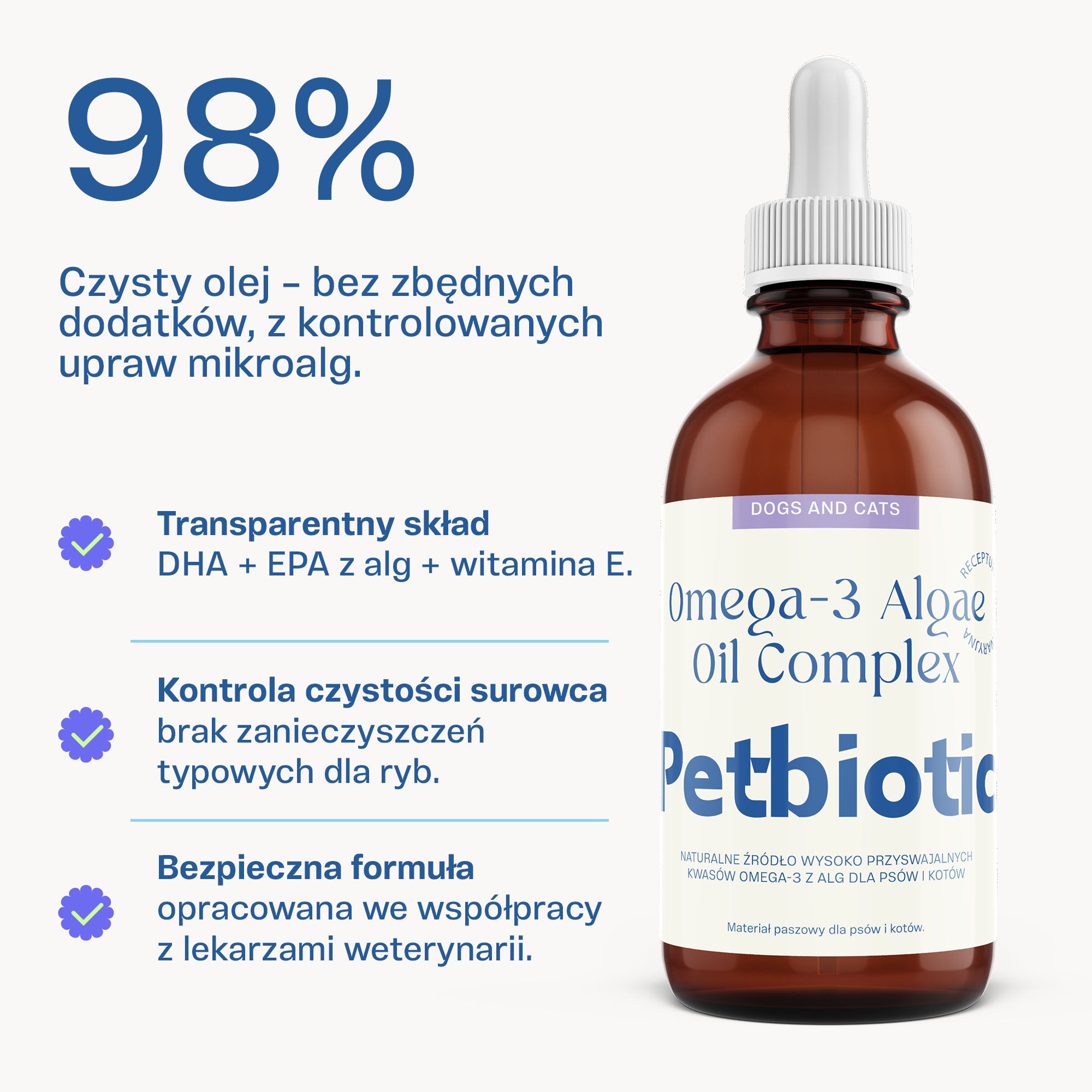 Olej z alg Petbiotic to nowoczesne źródło kwasów omega-3 (DHA i EPA), stworzone z myślą o codziennym zdrowiu psów i kotów. Zamiast olejów rybnych sięgamy po algi — naturalne, pierwotne źródło omega-3, pozyskiwane w kontrolowanych warunkach. Dzięki temu olej jest czysty, stabilny i przyjazny dla wrażliwych pupili.